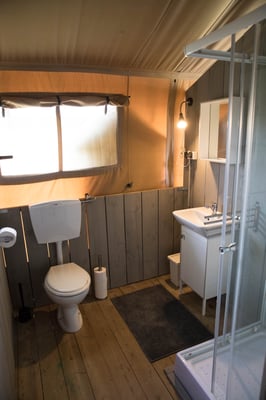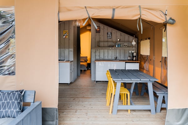 Onze Safaritent XL is de grootste van allemaal en is geschikt voor 6 personen. De Safaritent is 12 x 5 meter inclusief een ruime veranda, met recht XL dus! De Safaritent heeft eigen sanitair, 3 slaapkamers en een ruime woonkamer en keuken met vaatwasser! Ook is het mogelijk om een campingbedje te plaatsen.
