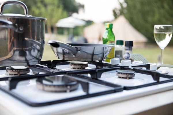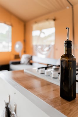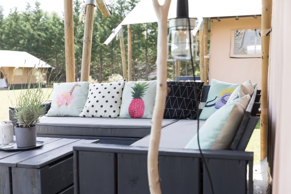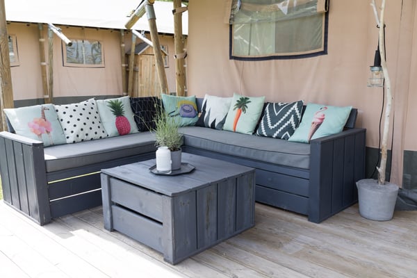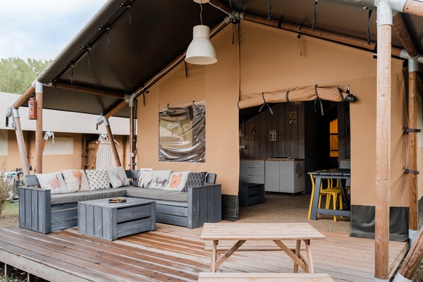 Op de grote veranda kun je heerlijk ontspannen op de grote loungebank. En natuurlijk heeft de Safaritent een compleet ingerichte keuken met verrijdbaar kookgedeelte zodat je buiten kunt koken!
